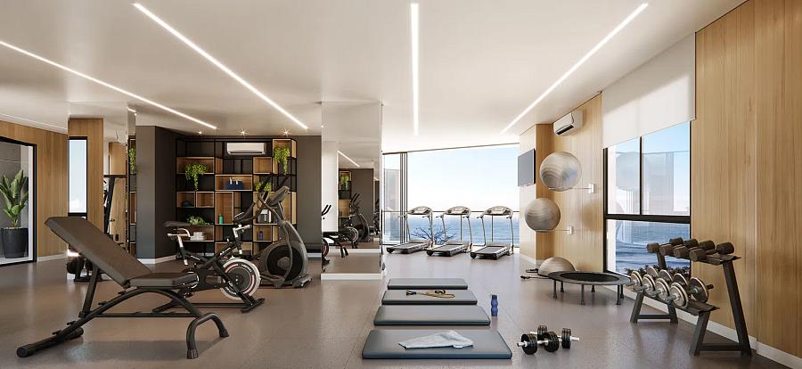 🔹 Academia moderna – Espaço climatizado e equipado com vista para o mar.