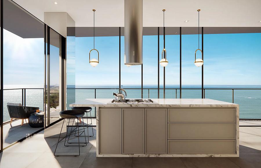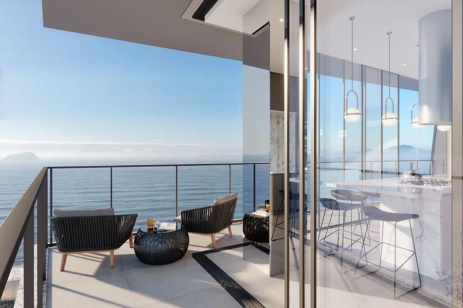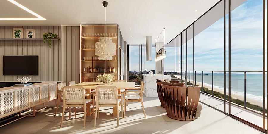 Os apartamentos contam com portas-janelas do piso ao teto , oferecendo iluminação natural abundante e vistas espetaculares do mar. Além disso, possuem churrasqueira a carvão, esquadrias de alumínio com vidro laminado e acabamentos premium .