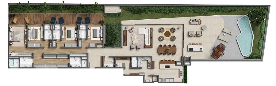São 579,09 m² privativos, com ambientes generosos e integração entre áreas sociais e externas, criando uma atmosfera de casa suspensa à beira-mar.